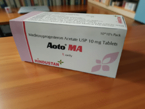 Aoto-MA 10mg Tablet is similar to the progesterone hormone naturally produced by the body. It helps regulate abnormal uterine bleeding, induces withdrawal bleeding in cases of amenorrhea (the absence of menstrual periods), and may also be used to treat endometriosis.