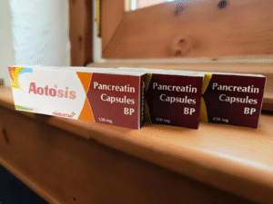 Aotosis Capsule should be taken during or immediately after eating a meal or a snack with plenty of water. This helps the enzymes mix with the food so they can help digest it. The dose you’re given will depend on your condition and how you respond to the medicine. You should take this medicine until your doctor tells you to stop. You may be taking it for the rest of your life, so get into a routine and make sure you take it regularly. Aotosis Capsule may only be a part of your treatment which could include a special diet.